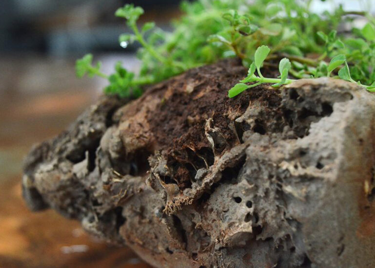 The consistency of the Bio-Brick is light and perforated, with more air pockets than a standard brick. The intention was to create a building block that allows animal and plant life to thrive, creating a strong connection back to the the natural environment.