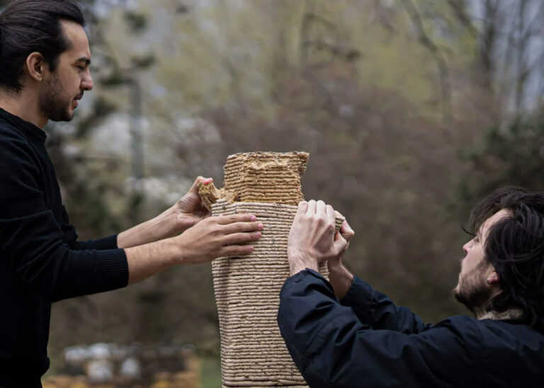 To create the formwork, DART mixed sawdust with biopolymers and additives to create its structure and strength. The mixture was then 3D printed into a 1.8 meter column (with a hollow center). The team then poured concrete into the column and once dry, the sawdust formwork was peeled off. The sawdust material was then saved and recycled by adding water and reused over 25 times to create additional columns.