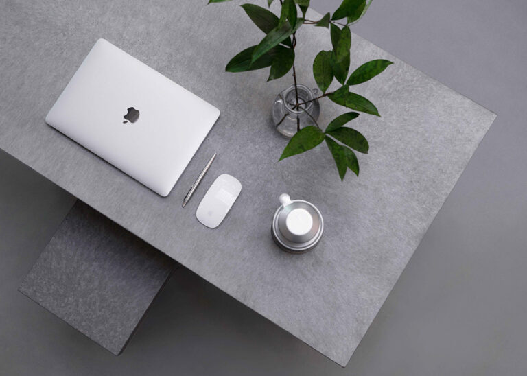 DCSG studio has produced a furniture set made entirely from recycled plastic waste that looks like concrete. The range consists of one table and four stools and is inspired by 20th century Modernist Architecture. The furniture forms are bold but have been constructed using woodworking techniques using wooden pins and fasteners. This traditional construction technique allows for the furniture to be disassembled and recycled into plastic boards after use.