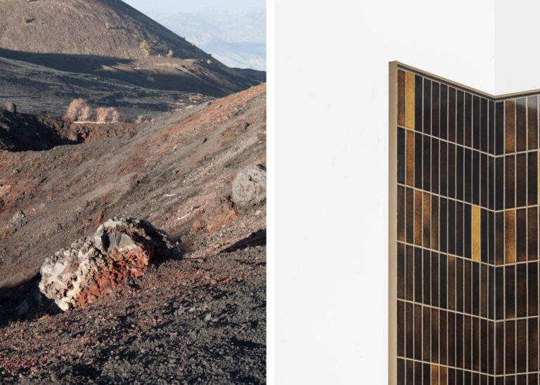 ExCinere is a collection of volcanic ash-glazed tiles developed by Dzek, Studio Formafantasma and a team of scientists and volcanologists. Volcanic Ash is a naturally occurring product that is expelled from the earth without any human intervention. Volcanic ash and basalt rock have high metal oxide content which makes them complex and unpredictable to work with. The team took three years of research to discover the perfect balance of porcelain, ash glazes and firing techniques.