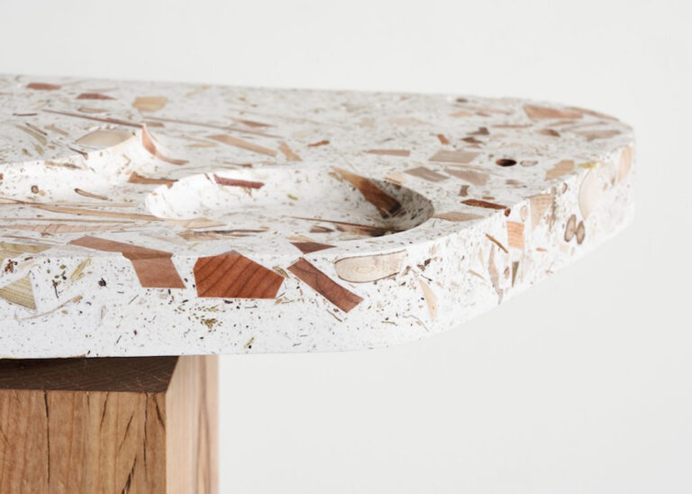 ForestBank by Yuma Kano shows value and beauty in items like foliage, bark, seeds and soil that would otherwise be dismissed as worthless in construction or furniture making. The debris is mixed in with a mineral-based and water-based acyrlic resin to set into the mold.