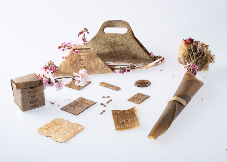 Nice to Seed You is a series of plantable cards created by Laura Bordini. The cards are created using a recipe of glycerine, gelatine/xanthan gum, seeds and microalgae harvested from a domestic wastewater centre in Germany. The project aims to raise awareness about the circular process of material life cycles by generating usable ingredients from industrial waste. the product is intended to be used as a post card or packaging material and can be planted after being shipped.