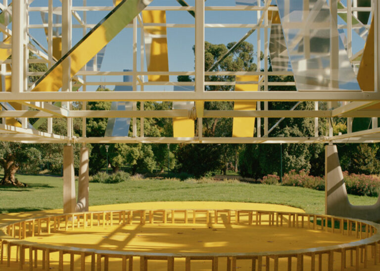 Designed by Kerli Valk and Bradley Mitchell of Nüüd Studio, winners of the chair design commission for MPavilion 2021, the ‘Dancer’ chairs were first a single circle drawn within the MPavilion, then evenly divided into 40 segments to create the individual chairs which each share the mark of open hands to reconnect again. The ‘Dancer’ chair was influenced by MAP studio (Venice)’s MPavilion in form, colour and material. The chairs were made from melted recycled plastic, made up of mostly milk and juice bottles.