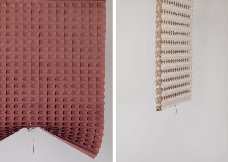 Passionate about the environment, Natchar Sawatdichai has created a series of intricate paper blinds. The series moves away from typical materials used in blinds that require excessive energy to dispose of and focuses on her favorite medium – paper. Each blind is hand-cut in an origami like pattern that allows flittered light to flow through.
