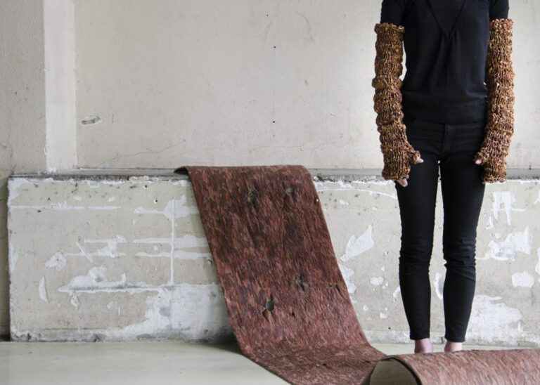 PineSkins by Studio Sarmite turns bark, (a by-product from the existing pine tree-cutting industry) into a leather-like material. Once harvested the bark is soaked in bio-softening solution and then coated with wax to ensure its durable. Natural colour pigments are then added to turn the bark into a range of neutral tones. Sarmite Polakova has proved the potential of PineSkins in her own collection of vases, vessels and rugs made and inspired by the lines and shapes of trees in forests.