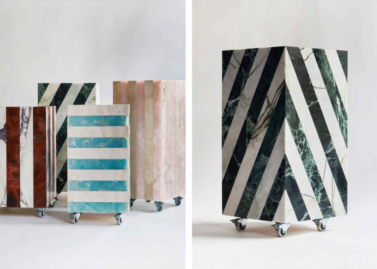 The ‘Breton’ cube is a collaboration between Netherland based Stone Supplier ‘SolidNature’ and Danish Artist and designer Brigitte Due Madsen. The cubes are formed out of off cuts from larger slabs of marble, onyx and travertine, embedding a sustainable approach to design and waste within the industry. Each design is unique and never the same, creating a striking contrast with rich whites or creams, further enhancing the Breton-stripe-inspired pattern. The cubes are designed with mobility aspects to them, equipped with wheels, they can be moved around to different rooms when needed.
