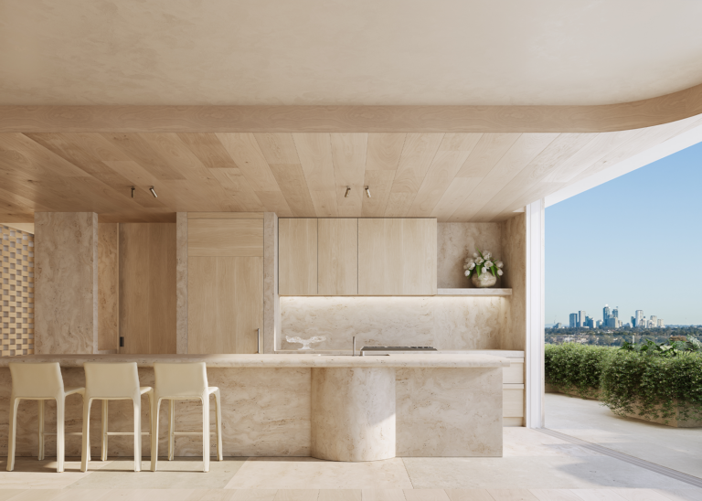 Sitting atop developer DARE property group’s seven-storey project Amara, the penthouse has just launched. Spanning 570 square metres, the whole-floor penthouse features travertine and oak flooring, polished plaster walls, bronze hardware and panoramic harbour views.
