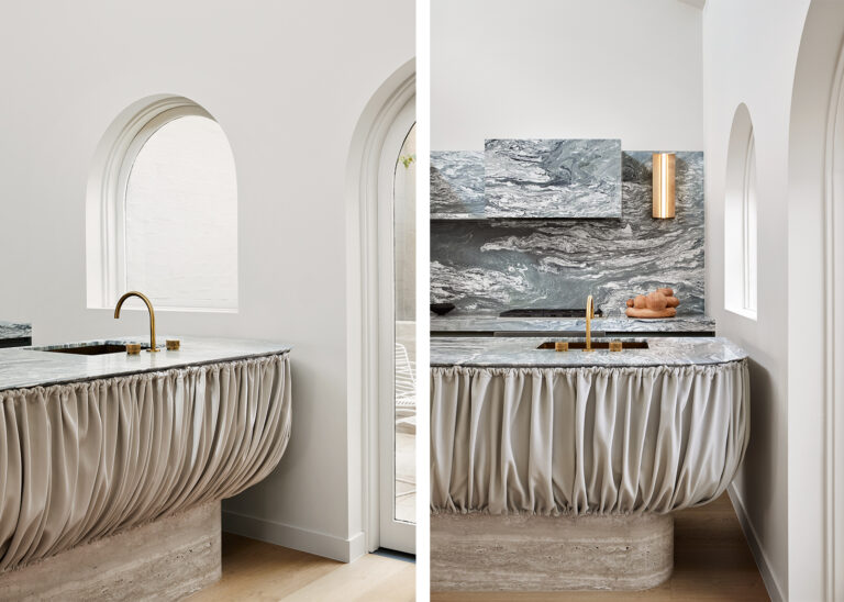 FLO began by designing the focal entertaining areas, where design details and an exploration of mixed materiality and textures offer a beautifully resolved outcome. A bar in pink Cristallo Rosa onyx marble with brass joinery and grass cloth wrapped retractable cabinet drawers. The kitchen is anchored by a Le Corbusier-inspired curved fork island bench wrapped in rouched leather, with a tumbled travertine base and topped with an expressive Vaticano marble. Within the kitchen, oak veneer joinery has a 2pac finish in petrol green with brushed brass handles and Volker Haug wall lights in raw hand-worked aluminium.