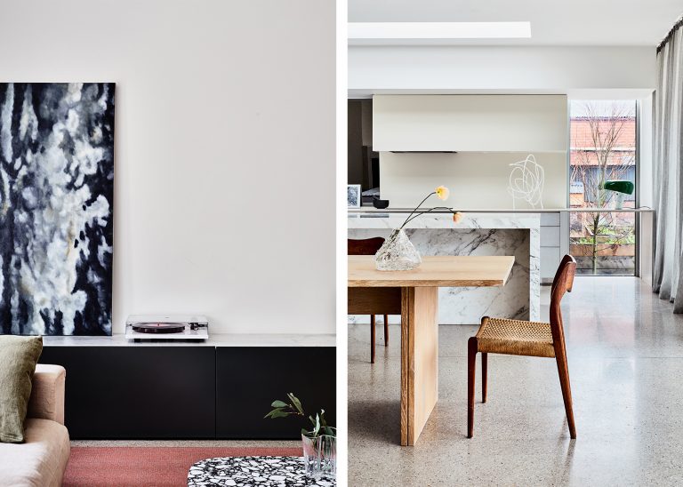 A threshold of blackened steel expresses the transition to the rear of the home, accommodating an airy and sun-filled living area. This space is intentionally understated and pure in form and materiality, presenting a carte-blanc space to be enlivened by family life. The kitchen’s weighty island bench is offset by a fine, floating benchtop beyond; a play on scale and mass. An angled smoke mirror splashback reflects the activity of the adjacent dining space, where an intricate aged brass pendant floats over a bespoke heart oak dining table.